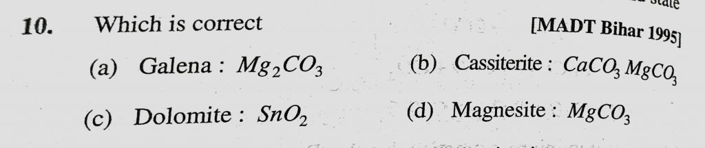 Which is correct (a) Galena : Mg2CO3 (b) Cassiterite : CaCO3 MgCO3 (c) Dolomite : SnO2 (d) Magnesite : MgCO3 Which is correct (a) Galena : Mg2CO3 (b) Cassiterite : CaCO3 MgCO3 (c) Dolomite : SnO2 (d) Magnesite : MgCO3 November 12, 2020 Category: Uncategorised (JEE Advanced Physics by BM Sharma + GMP Solutions) , Facebook Messenger WhatsApp Share this:TwitterFacebook Related