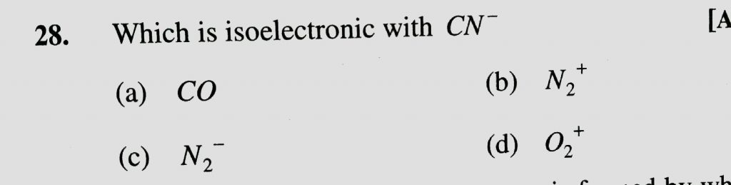 Which is isoelectronic with CN^- (a) CO (b) N2^+ (c) N2^- (d) O2^+ Which is isoelectronic with CN^- (a) CO (b) N2^+ (c) N2^- (d) O2^+ December 1, 2020 Category: Uncategorised (JEE Advanced Physics by BM Sharma + GMP Solutions) , Facebook Messenger WhatsApp Share this:TwitterFacebook Related