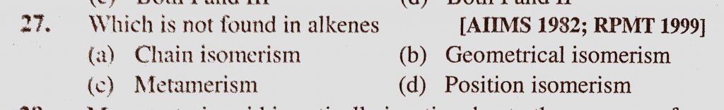 Which is not found in alkenes (a) Chain isomerism (b) Geometrical isomerism (c) Metamerism(d) Position isomerism Which is not found in alkenes (a) Chain isomerism (b) Geometrical isomerism (c) Metamerism(d) Position isomerism December 10, 2020 Category: Uncategorised (JEE Advanced Physics by BM Sharma + GMP Solutions) , Facebook Messenger WhatsApp Share this:TwitterFacebook Related