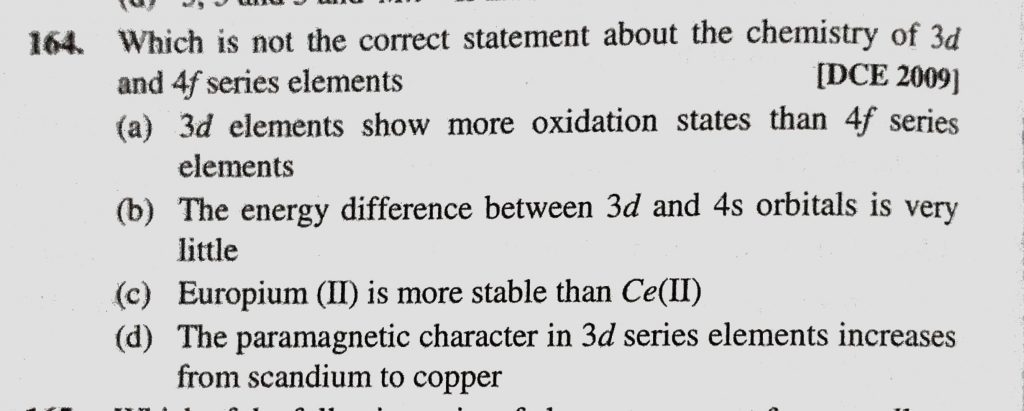 Which is not the correct statement about the chemistry of 3d and 4f series elements (a) 3d elements show more oxidation states than 4f series elements Which is not the correct statement about the chemistry of 3d and 4f series elements (a) 3d elements show more oxidation states than 4f series elements November 30, 2020 Category: Uncategorised (JEE Advanced Physics by BM Sharma + GMP Solutions) , Facebook Messenger WhatsApp Share this:TwitterFacebook Related