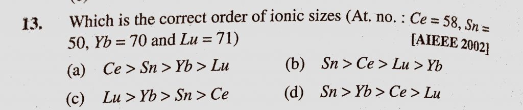 Which is the correct order of ionic sizes (At. no. : Ce = 58, Sn = 50 , Yb = 70 and Lu = 71) (a) Ce > Sn > Yb > Lu Sn = 50 Which is the correct order of ionic sizes (At. no. : Ce = 58 Yb = 70 and Lu = 71) (a) Ce > Sn > Yb > Lu November 10, 2020 Category: Uncategorised (JEE Advanced Physics by BM Sharma + GMP Solutions) , Facebook Messenger WhatsApp Share this:TwitterFacebook Related