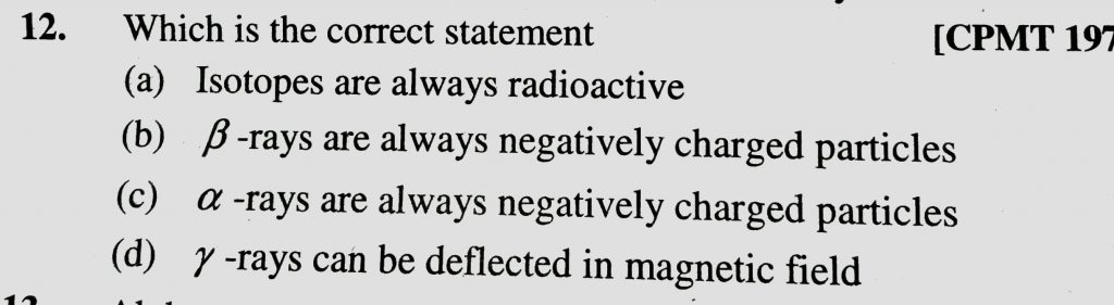 Which is the correct statement (a) Isotopes are always radioactive (b) bita rays are always negatively charged particles Which is the correct statement (a) Isotopes are always radioactive (b) bita rays are always negatively charged particles February 13, 2021 Category: Uncategorised (JEE Advanced Physics by BM Sharma + GMP Solutions) , Facebook Messenger WhatsApp Share this:TwitterFacebook Related