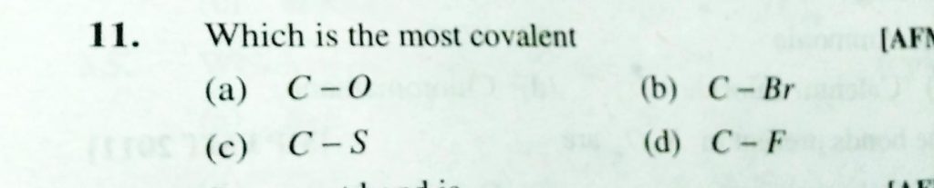 Which is the most covalent (a) C – O (b) C – Br (c) C – S (d) C – F Which is the most covalent (a) C - O (b) C - Br (c) C - S (d) C - F December 1, 2020 Category: Uncategorised (JEE Advanced Physics by BM Sharma + GMP Solutions) , Facebook Messenger WhatsApp Share this:TwitterFacebook Related