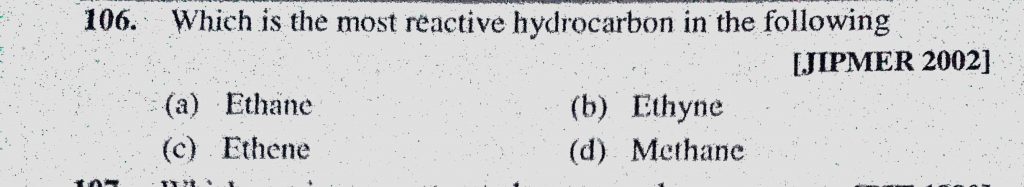 Which is the most reactive hydrocarbon in the following (a) Ethane (b) Ethyne (c) Ethene (d) Methane Which is the most reactive hydrocarbon in the following (a) Ethane (b) Ethyne (c) Ethene (d) Methane December 14, 2020 Category: Uncategorised (JEE Advanced Physics by BM Sharma + GMP Solutions) , Facebook Messenger WhatsApp Share this:TwitterFacebook Related