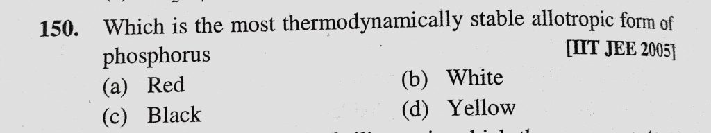 Which is the most thermodynamically stable allotropic form of phosphorus (a) Red (b) White (c) Black (d) Yellow Which is the most thermodynamically stable allotropic form of phosphorus (a) Red (b) White (c) Black (d) Yellow November 28, 2020 Category: Uncategorised (JEE Advanced Physics by BM Sharma + GMP Solutions) , Facebook Messenger WhatsApp Share this:TwitterFacebook Related