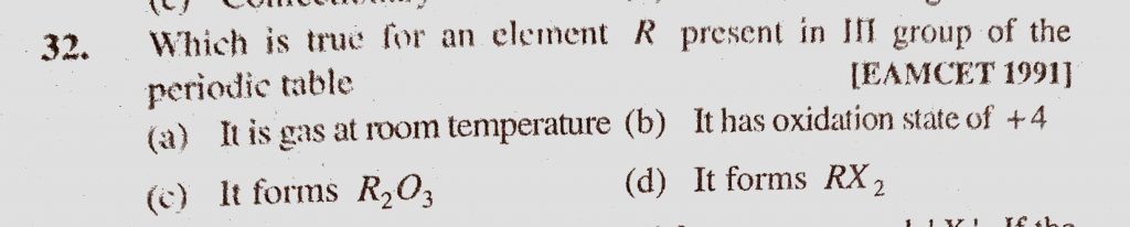 Which is true for an element R present in III group of the periodic table (a) It is gas at room temperature (b) It has oxidation state of +4 (c) It forms R2O3 Which is true for an element R present in III group of the periodic table (a) It is gas at room temperature (b) It has oxidation state of +4 (c) It forms R2O3 November 17, 2020 Category: Uncategorised (JEE Advanced Physics by BM Sharma + GMP Solutions) , Facebook Messenger WhatsApp Share this:TwitterFacebook Related
