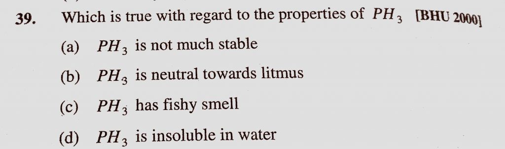 Which is true with regard to the properties of PH3 (a) PH3 is not much stable (b) PH3 is neutral towards litmus Which is true with regard to the properties of PH3 (a) PH3 is not much stable (b) PH3 is neutral towards litmus November 18, 2020 Category: Uncategorised (JEE Advanced Physics by BM Sharma + GMP Solutions) , Facebook Messenger WhatsApp Share this:TwitterFacebook Related