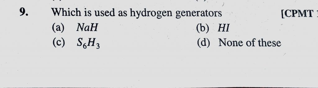 Which is used as hydrogen generatore (a) NaH (b) HI (c) S6H3 (d) None of these Which is used as hydrogen generatore (a) NaH (b) HI (c) S6H3 (d) None of these November 12, 2020 Category: Uncategorised (JEE Advanced Physics by BM Sharma + GMP Solutions) , Facebook Messenger WhatsApp Share this:TwitterFacebook Related