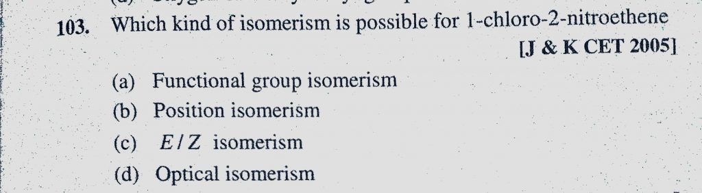 Which kind of isomerism is possible for 1-chloro-2-nitroethene (a) funcitonal group isomerism (b) Position isomerism Which kind of isomerism is possible for 1-chloro-2-nitroethene (a) funcitonal group isomerism (b) Position isomerism December 10, 2020 Category: Uncategorised (JEE Advanced Physics by BM Sharma + GMP Solutions) , Facebook Messenger WhatsApp Share this:TwitterFacebook Related