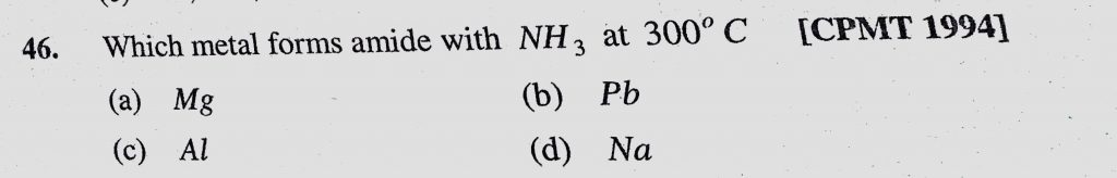 Which metal forms amide with NH3 at 300 C (a) Mg (b) Pb (c) Al (d) Na Which metal forms amide with NH3 at 300 C (a) Mg (b) Pb (c) Al (d) Na November 13, 2020 Category: Uncategorised (JEE Advanced Physics by BM Sharma + GMP Solutions) , Facebook Messenger WhatsApp Share this:TwitterFacebook Related