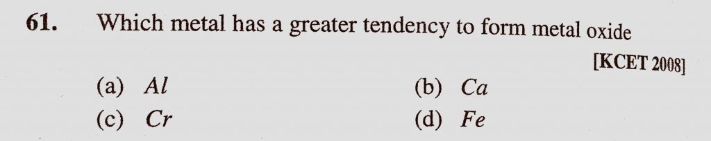 Which metal has a greater tendency to form metal oxide (a) Al (b) Ca (c) Cr (d) Fe Which metal has a greater tendency to form metal oxide (a) Al (b) Ca (c) Cr (d) Fe November 17, 2020 Category: Uncategorised (JEE Advanced Physics by BM Sharma + GMP Solutions) , Facebook Messenger WhatsApp Share this:TwitterFacebook Related