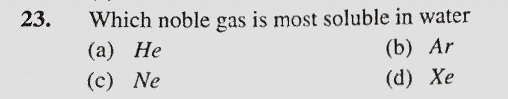 Which noble gas is most soluble in water (a) He (b) Ar (c) Ne (d) Xe Which noble gas is most soluble in water (a) He (b) Ar (c) Ne (d) Xe November 25, 2020 Category: Uncategorised (JEE Advanced Physics by BM Sharma + GMP Solutions) , Facebook Messenger WhatsApp Share this:TwitterFacebook Related