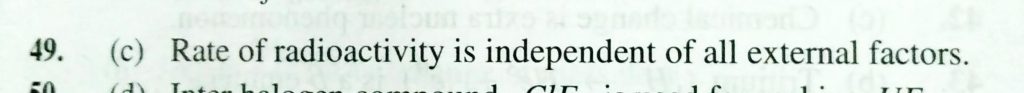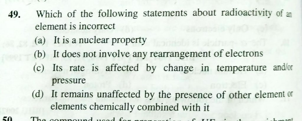 Which of teh following statements about radioactivity of an element is incorrect (a) It is a nuclear property (b) It does not involve any rearrangement of electrons (c) Its rate is affected by change in temperature and /or pressure (d) It remains unaffected by the presence of other element or element chemically combined with it
