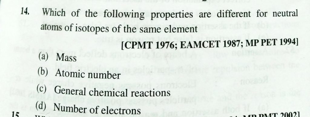 Which of th following properties are different for neutral atoms of isotopes of the same element (a) mass (b) atomic number (c) general chemical reactions (d) number of electrons Which of th following properties are different for neutral atoms of isotopes of the same element (a) mass (b) atomic number (c) general chemical reactions (d) number of electrons February 13, 2021 Category: Uncategorised (JEE Advanced Physics by BM Sharma + GMP Solutions) , Facebook Messenger WhatsApp Share this:TwitterFacebook Related