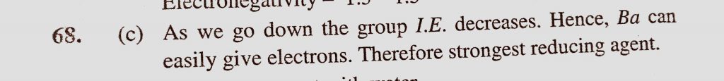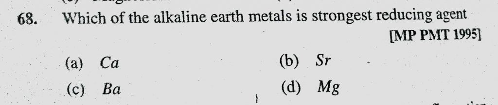 Which of the alkaline earth metals is strongest reducing agent (a) Ca (b) Sr (c) Ba (d) Mg Which of the alkaline earth metals is strongest reducing agent (a) Ca (b) Sr (c) Ba (d) Mg November 15, 2020 Category: Uncategorised (JEE Advanced Physics by BM Sharma + GMP Solutions) , Facebook Messenger WhatsApp Share this:TwitterFacebook Related