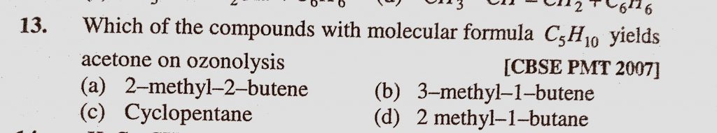 Which of the compounds with molecular formula C5H10 yields acetone on ozonolysis (a) 2-methyl-2-butene (b) 3-methyl-1-butene (c) Cyclopentane Which of the compounds with molecular formula C5H10 yields acetone on ozonolysis (a) 2-methyl-2-butene (b) 3-methyl-1-butene (c) Cyclopentane December 13, 2020 Category: Uncategorised (JEE Advanced Physics by BM Sharma + GMP Solutions) , Facebook Messenger WhatsApp Share this:TwitterFacebook Related