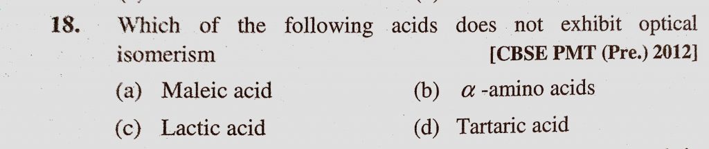 Which of the following acids does not exhibit optical isomerism (a) Maleic acid (b) alpha-amino acids (c) Lactic acids Which of the following acids does not exhibit optical isomerism (a) Maleic acid (b) alpha-amino acids (c) Lactic acids December 10, 2020 Category: Uncategorised (JEE Advanced Physics by BM Sharma + GMP Solutions) , Facebook Messenger WhatsApp Share this:TwitterFacebook Related