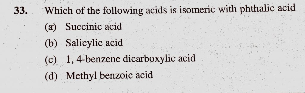 Which of the following acids is isomeric with phthalic acid (a) Succinic acid (b) Salicylic acid (c) 1, 4-benzene dicarboxylic acid (d) Methyl benzoic acid 4-benzene dicarboxylic acid (d) Methyl benzoic acid Which of the following acids is isomeric with phthalic acid (a) Succinic acid (b) Salicylic acid (c) 1 February 12, 2021 Category: Uncategorised (JEE Advanced Physics by BM Sharma + GMP Solutions) , Facebook Messenger WhatsApp Share this:TwitterFacebook Related