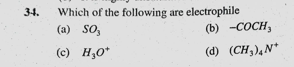 Which of the following are electrophile (a) SO3 (b) -COCH3 (c) H3O + (d) (CH3)4 N+ Which of the following are electrophile (a) SO3 (b) -COCH3 (c) H3O + (d) (CH3)4 N+ December 16, 2020 Category: Uncategorised (JEE Advanced Physics by BM Sharma + GMP Solutions) , Facebook Messenger WhatsApp Share this:TwitterFacebook Related