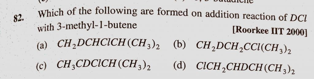 Which of the following are formed on addition reaction of DCl with 3-methyl-1-butene (a) CH2DCHClCH (CH3)2 (b) CH2DCH2CCl(CH3) 2 Which of the following are formed on addition reaction of DCl with 3-methyl-1-butene (a) CH2DCHClCH (CH3)2 (b) CH2DCH2CCl(CH3) 2 December 16, 2020 Category: Uncategorised (JEE Advanced Physics by BM Sharma + GMP Solutions) , Facebook Messenger WhatsApp Share this:TwitterFacebook Related