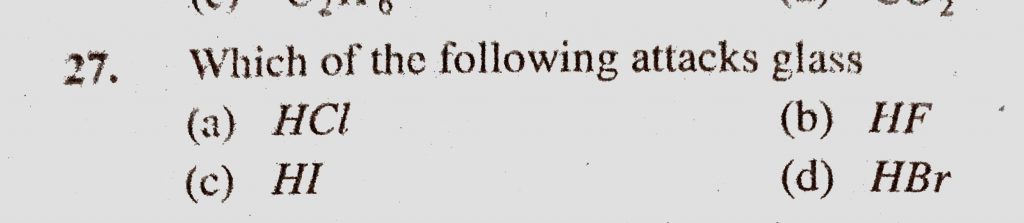 Which of the following attacks glass (a) HCl (b) HF (c) HI (d) HBr Which of the following attacks glass (a) HCl (b) HF (c) HI (d) HBr November 17, 2020 Category: Uncategorised (JEE Advanced Physics by BM Sharma + GMP Solutions) , Facebook Messenger WhatsApp Share this:TwitterFacebook Related
