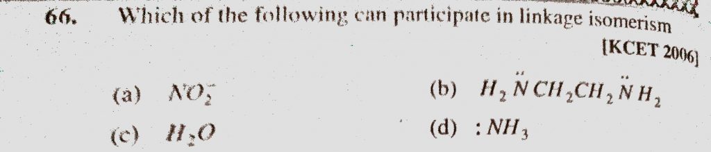 Which of the following can participate in linkage isomerism (a) NO2 – (b) H2NCH2CH2NH2 Which of the following can participate in linkage isomerism (a) NO2 - (b) H2NCH2CH2NH2 December 4, 2020 Category: Uncategorised (JEE Advanced Physics by BM Sharma + GMP Solutions) , Facebook Messenger WhatsApp Share this:TwitterFacebook Related