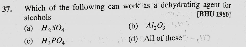 Which of the following can work as a dehydrating agent for alcohols (a) H2SO4 (b) Al2O3 (c) H3PO4 (d) All of these Which of the following can work as a dehydrating agent for alcohols (a) H2SO4 (b) Al2O3 (c) H3PO4 (d) All of these February 10, 2021 Category: Uncategorised (JEE Advanced Physics by BM Sharma + GMP Solutions) , Facebook Messenger WhatsApp Share this:TwitterFacebook Related