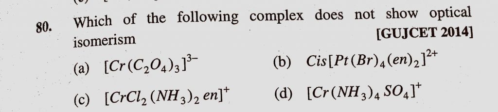 Which of the following complex does not show optical isomerism (a) (Cr(C2O4)3) 3- (b) Cis (Pt(Br)4(en)2) 2+ Which of the following complex does not show optical isomerism (a) (Cr(C2O4)3) 3- (b) Cis (Pt(Br)4(en)2) 2+ December 4, 2020 Category: Uncategorised (JEE Advanced Physics by BM Sharma + GMP Solutions) , Facebook Messenger WhatsApp Share this:TwitterFacebook Related