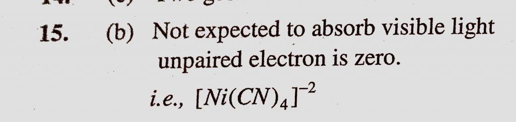 Which of the following complex ion is not expected to absorb visible light (a) (Ni(H2))6) 2+ (b) (Ni(CN)4)2- Which of the following complex ion is not expected to absorb visible light (a) (Ni(H2))6) 2+ (b) (Ni(CN)4)2- December 4, 2020 Category: Uncategorised (JEE Advanced Physics by BM Sharma + GMP Solutions) , Facebook Messenger WhatsApp Share this:TwitterFacebook Related