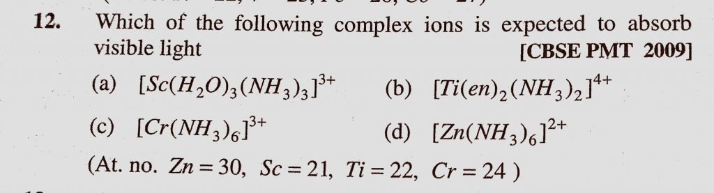 Which of the following complex ions is expected to absorb visible light (a) (Sc(H2O)3(NH3)3) 3+ (b) (Ti(en)2(NH3)2) 4+ Which of the following complex ions is expected to absorb visible light (a) (Sc(H2O)3(NH3)3) 3+ (b) (Ti(en)2(NH3)2) 4+ December 4, 2020 Category: Uncategorised (JEE Advanced Physics by BM Sharma + GMP Solutions) , Facebook Messenger WhatsApp Share this:TwitterFacebook Related