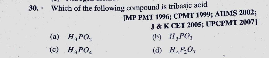 Which of the following compound is tribasic acid (a) H3PO2 (b) H3PO3 (c) H3PO4 (d) H4P2O7 Which of the following compound is tribasic acid (a) H3PO2 (b) H3PO3 (c) H3PO4 (d) H4P2O7 November 18, 2020 Category: Uncategorised (JEE Advanced Physics by BM Sharma + GMP Solutions) , Facebook Messenger WhatsApp Share this:TwitterFacebook Related