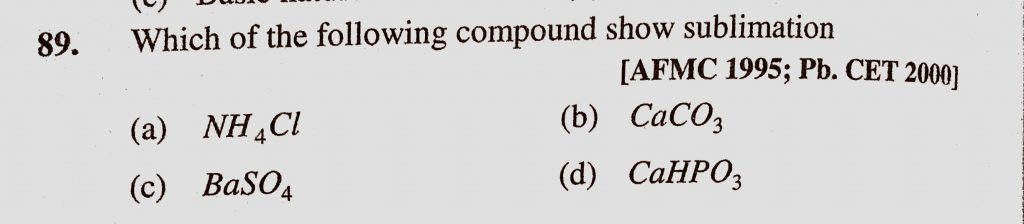 Which of the following compound show sublimation (a) NH4Cl (b) CaCO3 (c) BaSO4 (d) CaHPO3 Which of the following compound show sublimation (a) NH4Cl (b) CaCO3 (c) BaSO4 (d) CaHPO3 November 18, 2020 Category: Uncategorised (JEE Advanced Physics by BM Sharma + GMP Solutions) , Facebook Messenger WhatsApp Share this:TwitterFacebook Related