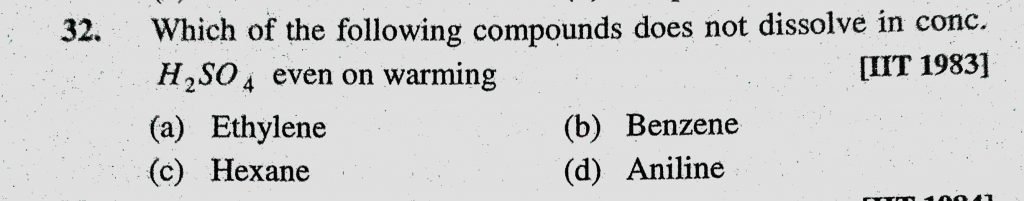 Which of the following compounds does not dissolve in conc. H2SO4 even on warming (a) Ethylene (b) Benzene (c) Hexane (d) Aniline Which of the following compounds does not dissolve in conc. H2SO4 even on warming (a) Ethylene (b) Benzene (c) Hexane (d) Aniline December 15, 2020 Category: Uncategorised (JEE Advanced Physics by BM Sharma + GMP Solutions) , Facebook Messenger WhatsApp Share this:TwitterFacebook Related