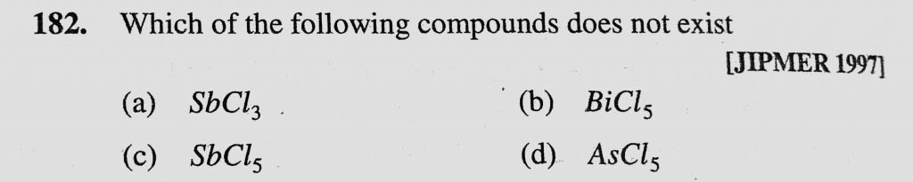 Which of the following compounds does not exist (a) SbCl3 (b) BiCl5 (c) SbCl5 (d) AsCl5 Which of the following compounds does not exist (a) SbCl3 (b) BiCl5 (c) SbCl5 (d) AsCl5 November 23, 2020 Category: Uncategorised (JEE Advanced Physics by BM Sharma + GMP Solutions) , Facebook Messenger WhatsApp Share this:TwitterFacebook Related
