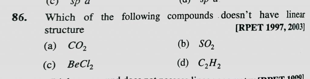 Which of the following compounds doesn’t have linear structure (a) CO2 (b) SO2 (c) BeCL2 (d) C2H2 Which of the following compounds doesn't have linear structure (a) CO2 (b) SO2 (c) BeCL2 (d) C2H2 December 6, 2020 Category: Uncategorised (JEE Advanced Physics by BM Sharma + GMP Solutions) , Facebook Messenger WhatsApp Share this:TwitterFacebook Related