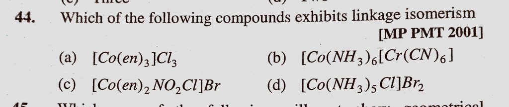Which of the following compounds exhibits linkage isomerism (a) (Co(en)3)Cl3 (b) (Co(NH3)6(Cr(CN)6) Which of the following compounds exhibits linkage isomerism (a) (Co(en)3)Cl3 (b) (Co(NH3)6(Cr(CN)6) December 4, 2020 Category: Uncategorised (JEE Advanced Physics by BM Sharma + GMP Solutions) , Facebook Messenger WhatsApp Share this:TwitterFacebook Related