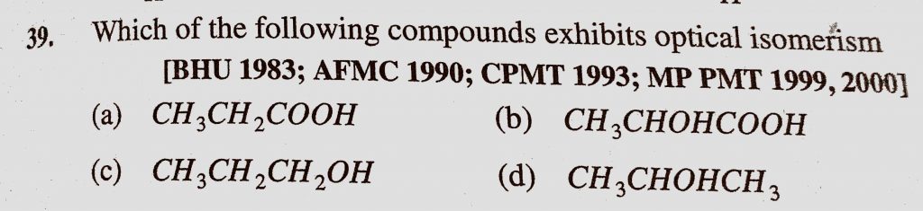 Which of the following compounds exhibits optical isomerism (a) CH3CH2COOH (b) CH3CHOHCOOH Which of the following compounds exhibits optical isomerism (a) CH3CH2COOH (b) CH3CHOHCOOH December 10, 2020 Category: Uncategorised (JEE Advanced Physics by BM Sharma + GMP Solutions) , Facebook Messenger WhatsApp Share this:TwitterFacebook Related