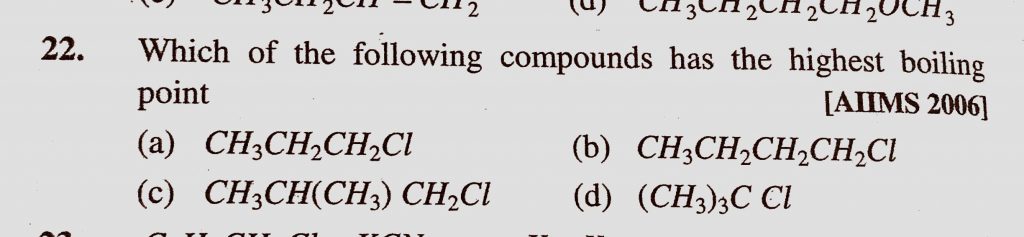 Which of the following compounds has the highest boiling point (a) CH3CH2CH2Cl (b) CH3CH2CH2CH2Cl (c) CH3CH(CH3)CH2Cl (d) (CH3)3C Cl Which of the following compounds has the highest boiling point (a) CH3CH2CH2Cl (b) CH3CH2CH2CH2Cl (c) CH3CH(CH3)CH2Cl (d) (CH3)3C Cl December 17, 2020 Category: Uncategorised (JEE Advanced Physics by BM Sharma + GMP Solutions) , Facebook Messenger WhatsApp Share this:TwitterFacebook Related