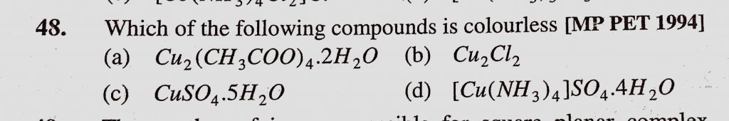 Which of the following compounds is colourless (a) Cu2(CH3COO)4.2SH2O (b) Cu2Cl2 (c) CuSO4.5H2O Which of the following compounds is colourless (a) Cu2(CH3COO)4.2SH2O (b) Cu2Cl2 (c) CuSO4.5H2O December 4, 2020 Category: Uncategorised (JEE Advanced Physics by BM Sharma + GMP Solutions) , Facebook Messenger WhatsApp Share this:TwitterFacebook Related