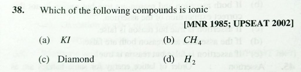 Which of the following compounds is ionic (a) KI (b) CH4 (c) Diamond (D) H2 Which of the following compounds is ionic (a) KI (b) CH4 (c) Diamond (D) H2 December 1, 2020 Category: Uncategorised (JEE Advanced Physics by BM Sharma + GMP Solutions) , Facebook Messenger WhatsApp Share this:TwitterFacebook Related