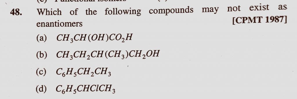 Which of the following compounds may not exist as enantiomers (a) CH3CH(OH)CO2H (b) CH3CH2CH(CH3)CH2OH Which of the following compounds may not exist as enantiomers (a) CH3CH(OH)CO2H (b) CH3CH2CH(CH3)CH2OH December 10, 2020 Category: Uncategorised (JEE Advanced Physics by BM Sharma + GMP Solutions) , Facebook Messenger WhatsApp Share this:TwitterFacebook Related