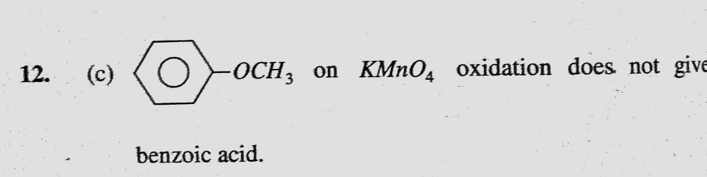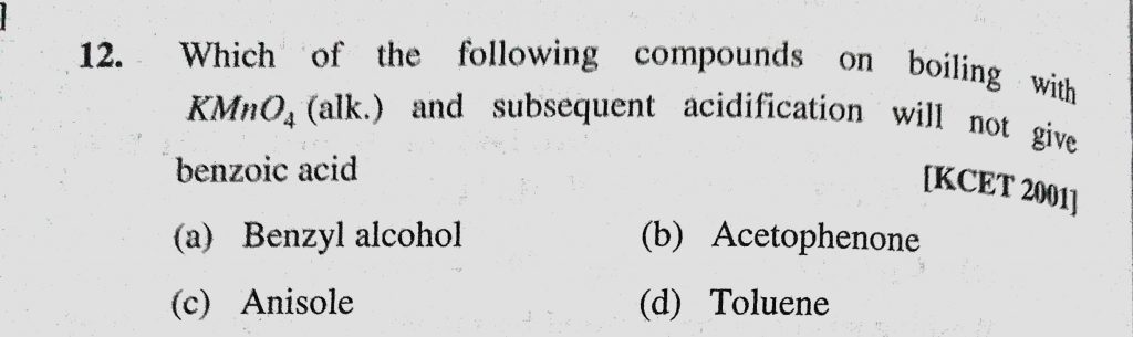 Which of the following compounds on boiling with KMnO4(alk.) and subsequent acidification will not give benzoic acid (a) Benzyl alcohol (b) Acetophenone (c) Anisole (d) Toluene Which of the following compounds on boiling with KMnO4(alk.) and subsequent acidification will not give benzoic acid (a) Benzyl alcohol (b) Acetophenone (c) Anisole (d) Toluene February 11, 2021 Category: Uncategorised (JEE Advanced Physics by BM Sharma + GMP Solutions) , Facebook Messenger WhatsApp Share this:TwitterFacebook Related