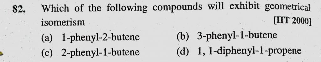 Which of the following compounds will exhibit geometrical isomerism (a) 1-phenyl-2-butene (b) 3-phenyl-1-butene Which of the following compounds will exhibit geometrical isomerism (a) 1-phenyl-2-butene (b) 3-phenyl-1-butene December 11, 2020 Category: Uncategorised (JEE Advanced Physics by BM Sharma + GMP Solutions) , Facebook Messenger WhatsApp Share this:TwitterFacebook Related