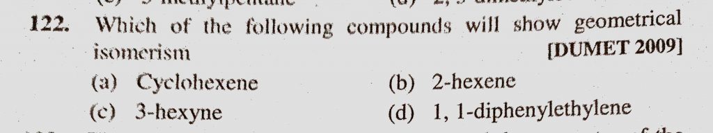 Which of the following compounds will show geometrical isomerism (a) cyclohexene (b) 2-hexene (c) 3-hexyne Which of the following compounds will show geometrical isomerism (a) cyclohexene (b) 2-hexene (c) 3-hexyne December 10, 2020 Category: Uncategorised (JEE Advanced Physics by BM Sharma + GMP Solutions) , Facebook Messenger WhatsApp Share this:TwitterFacebook Related