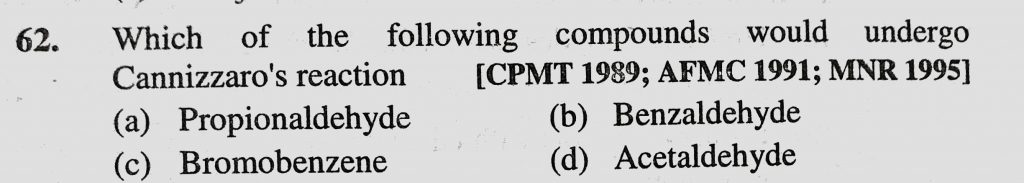 Which of the following compounds would undergo Cannizzaro’s reaction (a) Propionaldehyde (b) Benzaldehyde (c) Bromobenzene (d) Acetaldehyde Which of the following compounds would undergo Cannizzaro's reaction (a) Propionaldehyde (b) Benzaldehyde (c) Bromobenzene (d) Acetaldehyde February 11, 2021 Category: Uncategorised (JEE Advanced Physics by BM Sharma + GMP Solutions) , Facebook Messenger WhatsApp Share this:TwitterFacebook Related