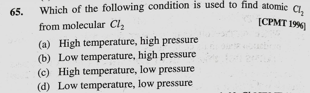 Which of the following condition is used to find atomic Cl2 from molecular Cl2 (a) High temperature, high pressure (b) Low temperature, high pressure high pressure high pressure (b) Low temperature Which of the following condition is used to find atomic Cl2 from molecular Cl2 (a) High temperature November 24, 2020 Category: Uncategorised (JEE Advanced Physics by BM Sharma + GMP Solutions) , Facebook Messenger WhatsApp Share this:TwitterFacebook Related