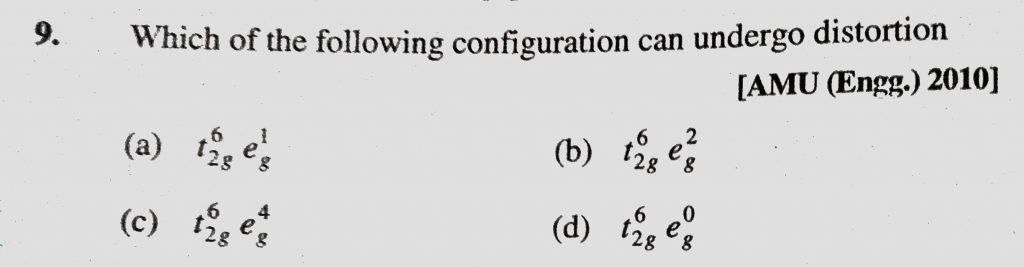 Which of the following configuration can undergo distortion (a) t2g eg (b) t2g eg Which of the following configuration can undergo distortion (a) t2g eg (b) t2g eg December 5, 2020 Category: Uncategorised (JEE Advanced Physics by BM Sharma + GMP Solutions) , Facebook Messenger WhatsApp Share this:TwitterFacebook Related