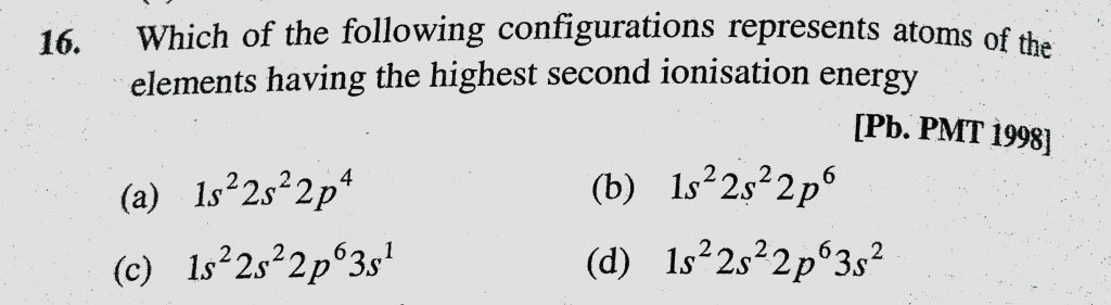 Which of the following configurations represents atoms of the elements having the highest second ionisation energy (a) 1s2 2s2 2p4 Which of the following configurations represents atoms of the elements having the highest second ionisation energy (a) 1s2 2s2 2p4 November 10, 2020 Category: Uncategorised (JEE Advanced Physics by BM Sharma + GMP Solutions) , Facebook Messenger WhatsApp Share this:TwitterFacebook Related