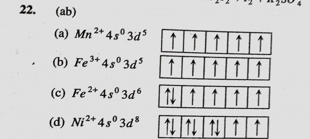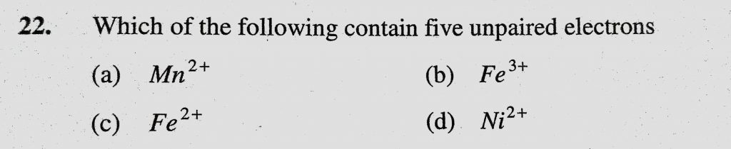 Which of the following contain five unpaired electrons (a) Mn2+ (b) Fe 3+ (c) Fe 2+ (d) Ni 2+ Which of the following contain five unpaired electrons (a) Mn2+ (b) Fe 3+ (c) Fe 2+ (d) Ni 2+ December 3, 2020 Category: Uncategorised (JEE Advanced Physics by BM Sharma + GMP Solutions) , Facebook Messenger WhatsApp Share this:TwitterFacebook Related