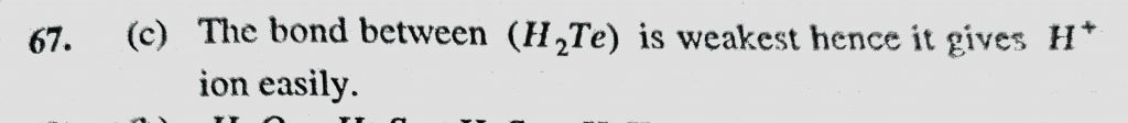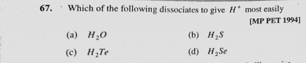Which of the following dissociates to give H+ most easily (a) H2O (b) H2S (c) H2Te (d) H2Se Which of the following dissociates to give H+ most easily (a) H2O (b) H2S (c) H2Te (d) H2Se November 23, 2020 Category: Uncategorised (JEE Advanced Physics by BM Sharma + GMP Solutions) , Facebook Messenger WhatsApp Share this:TwitterFacebook Related